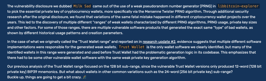 这些钱包的私钥由有缺陷的伪随机数生成器(PRNG)产生。由于PRNG使用了固定的偏移量(offset)和模式,导致私钥的可预测性增加。目前仍有用户持续向相关地址转账,显示漏洞风险尚未完全消除,美国执法部门和网络专家据推测也可能掌握了类似技术或线索。但也可能是美国政府通过社会工程,搜查取证,在线下拿到助记词或签名权,通过对诈骗集团进行渗透从而逐步控制私钥,但不管怎样,即使陈志本人尚未落网,但是这个诈骗集团引以为傲的「数字黄金」却已经悉数落网。