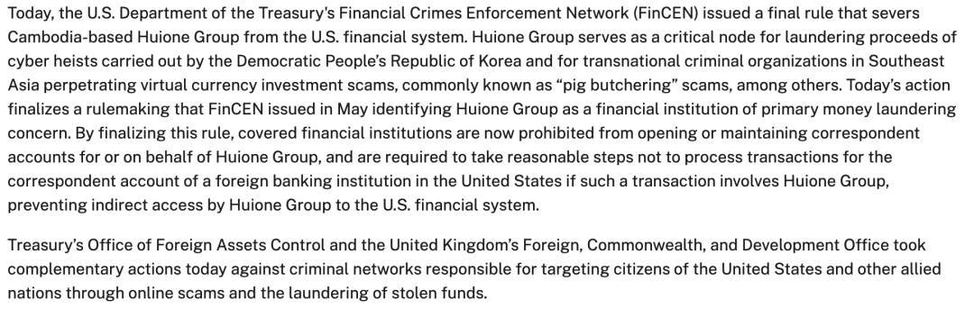 因此 OFAC 为了打击整个利益链条,对包括太子集团跨国犯罪组织在内的 146 个目标实施了全面制裁。其中汇旺集团(Huione Group)作为是柬埔寨本地的金融与电商生态,包含 HuionePay、Telegram 中介类市场等,直接被美国金融犯罪执法网络局(FinCEN)认定为太子集团主要洗钱活动的核心链条之一。