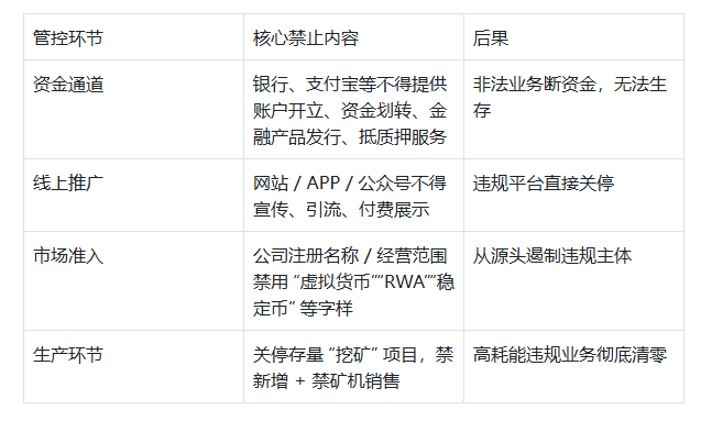 禁止行为:法币 - 虚拟货币兑换、币币交易、中介 / 清算服务、代币发行融资;