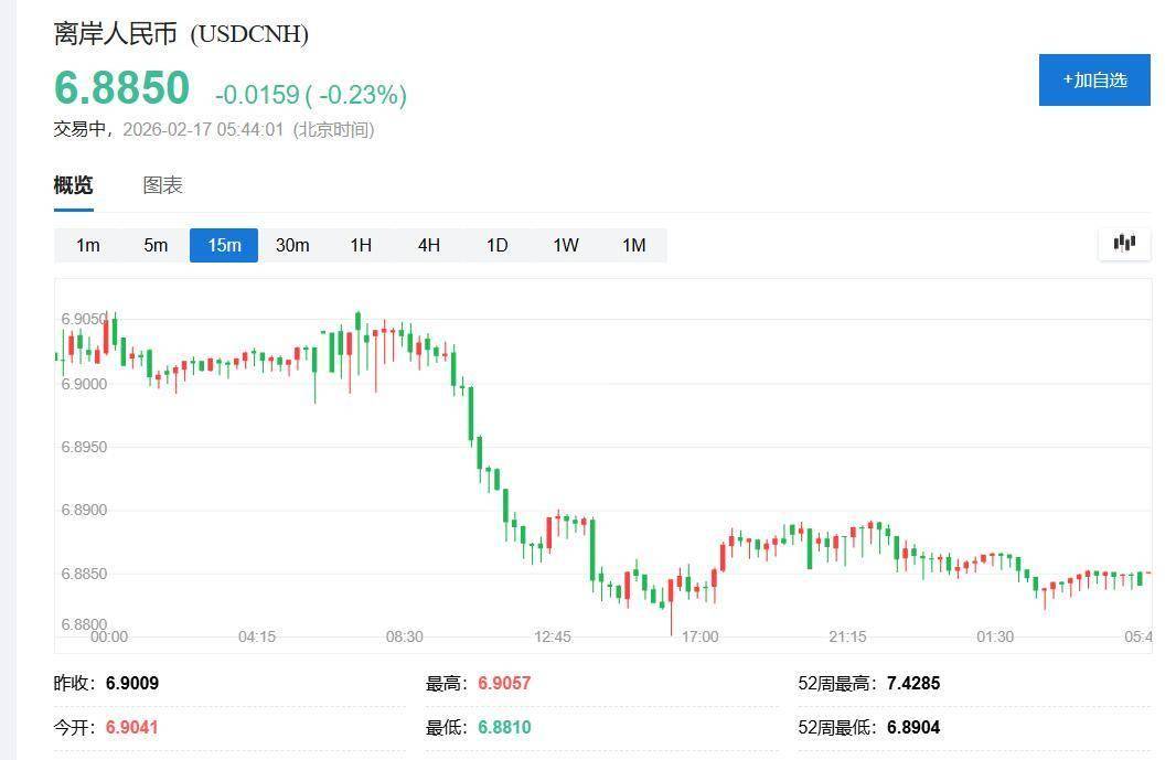 离岸人民币(CNH)兑美元在亚市早盘刷新日低至6.9058,亚市盘中转涨后保持涨势,欧市早盘涨至6.8810,刷新2023年4月21日涨至6.8780以来高位,自2023年4月以来首次盘中涨破6.89,日内涨202点。