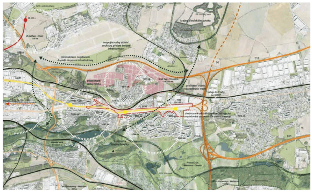 宏观背景层面:赫卢梅茨卡公路是布拉格城市的一个关键连接点,连接各个中心,并支持该地区的高密度居住。一项交通评估结果显示,这里存在提升公共交通、优化步行与骑行路线,以及融入景观元素以串联绿色空间的机遇。